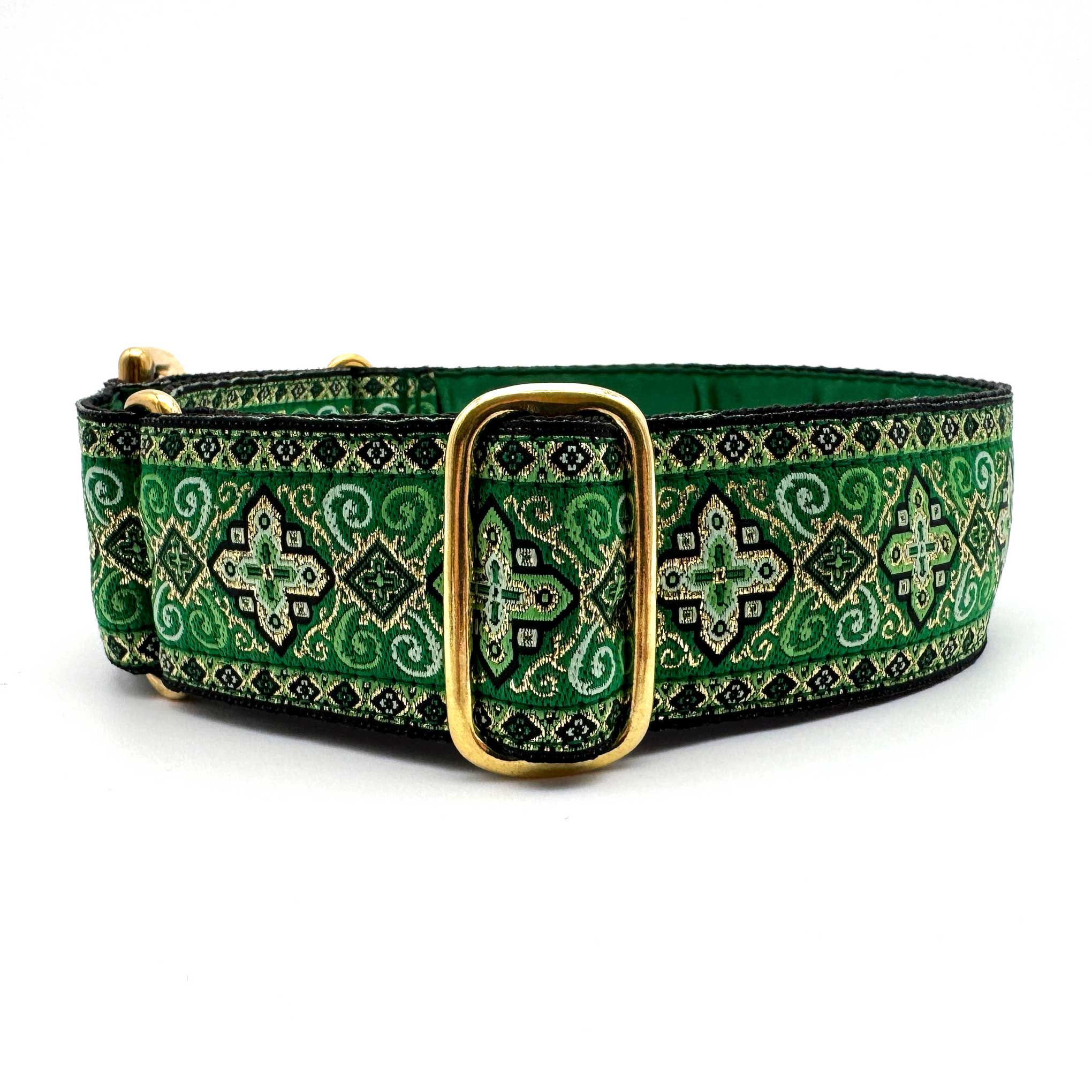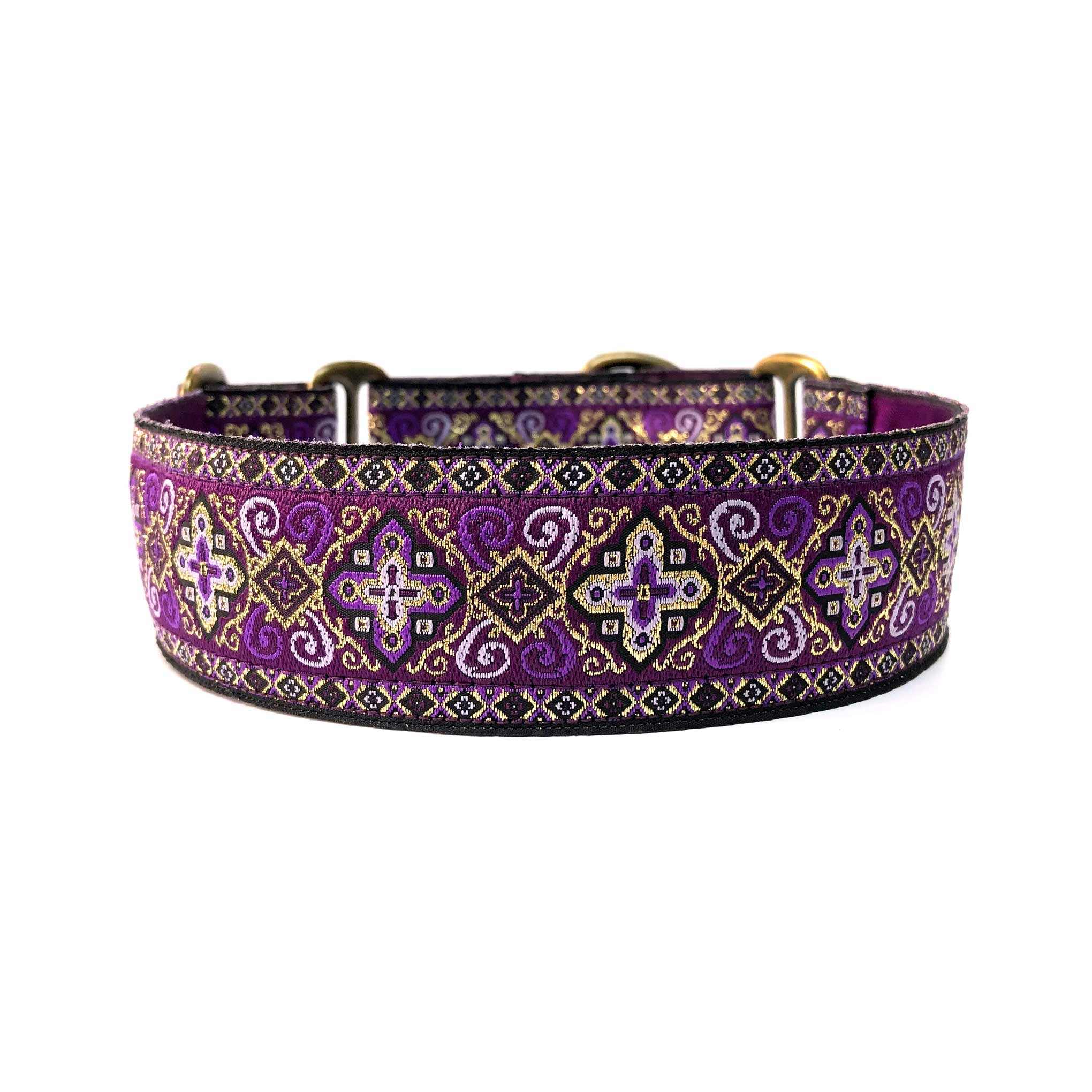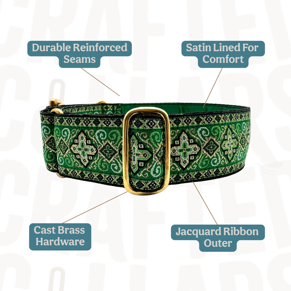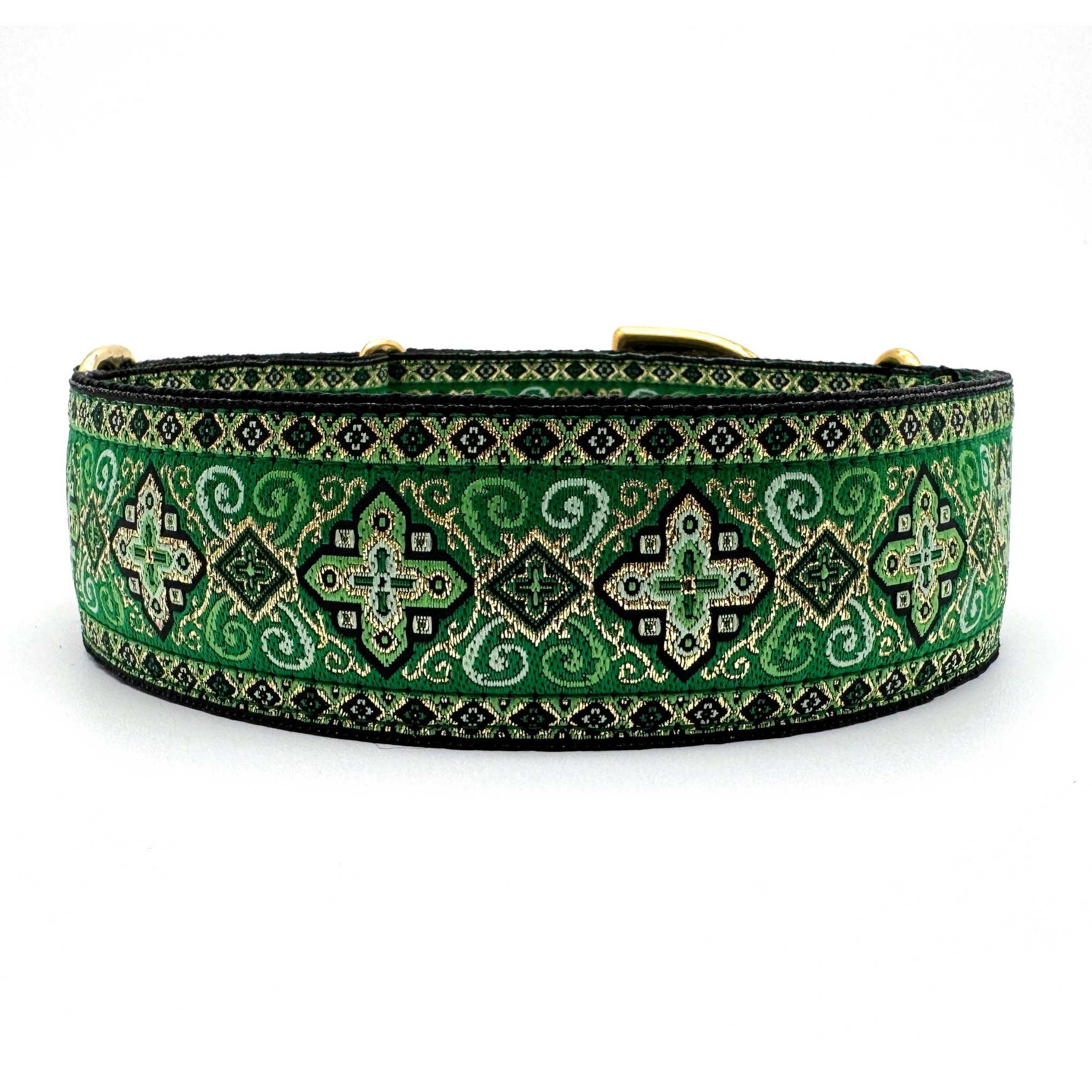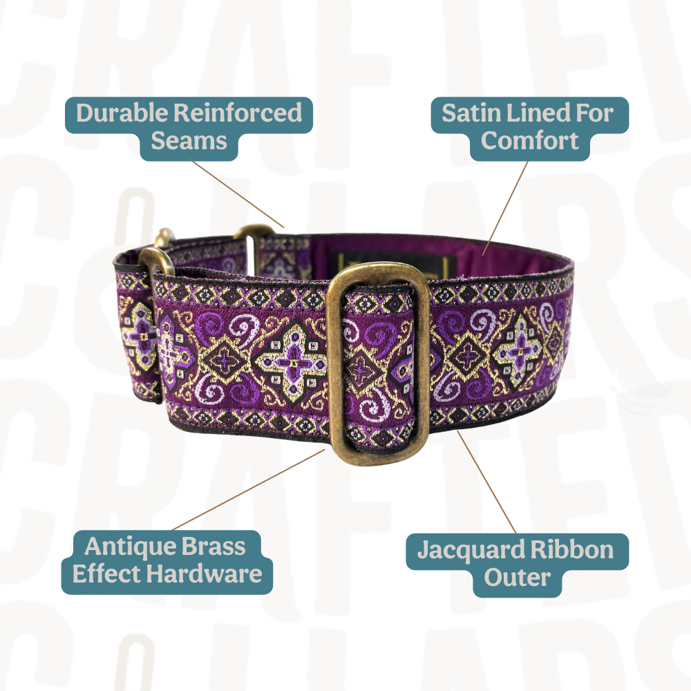 38mm (1.5") wide adjustable martingale dog collar featuring a rich jacquard ribbon with ornate geometric black and gold detailing woven into a vibrant coloured background. Lined with soft satin for comfort and finished with a choice of premium hardware, for a majestic statement.