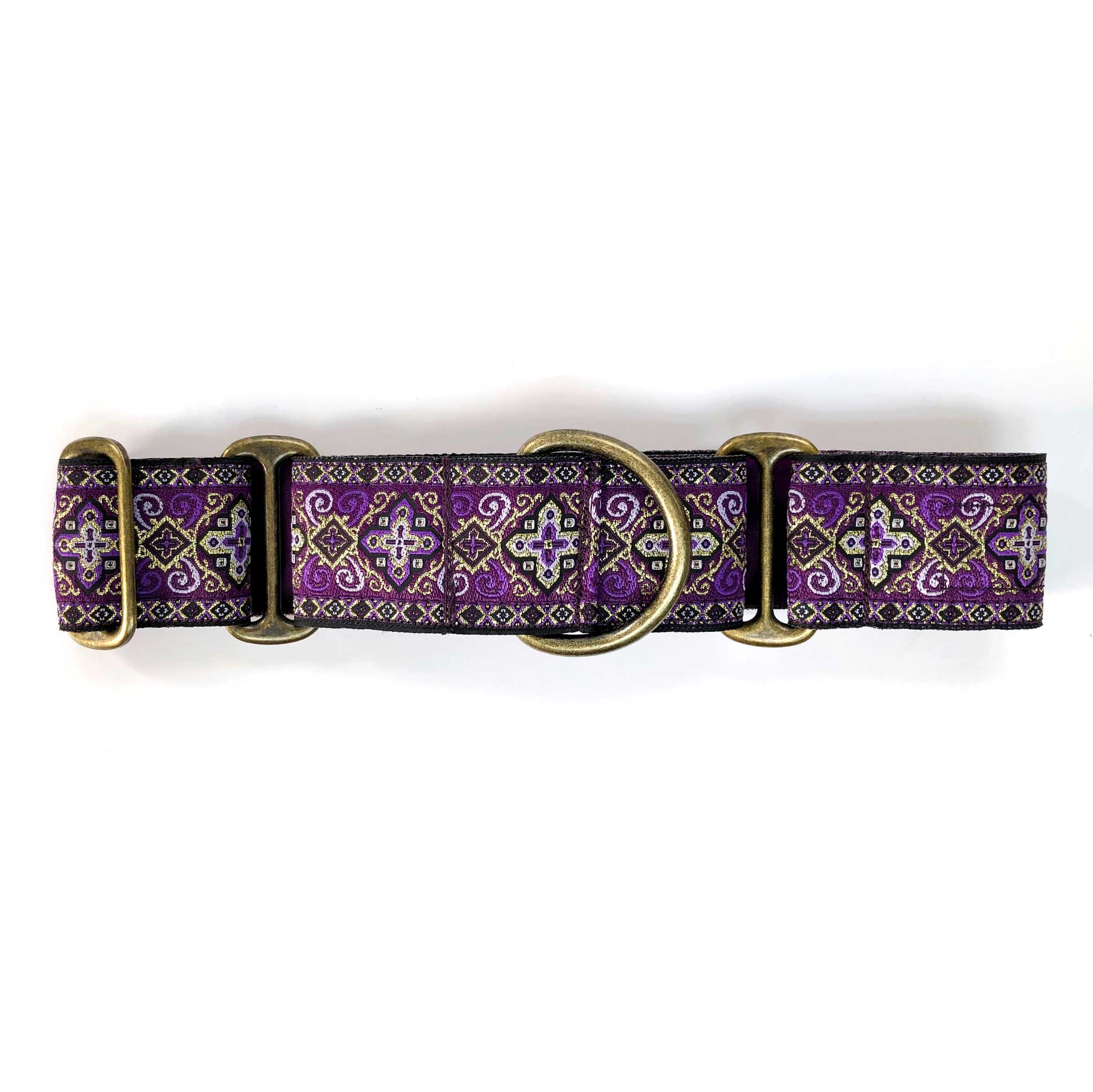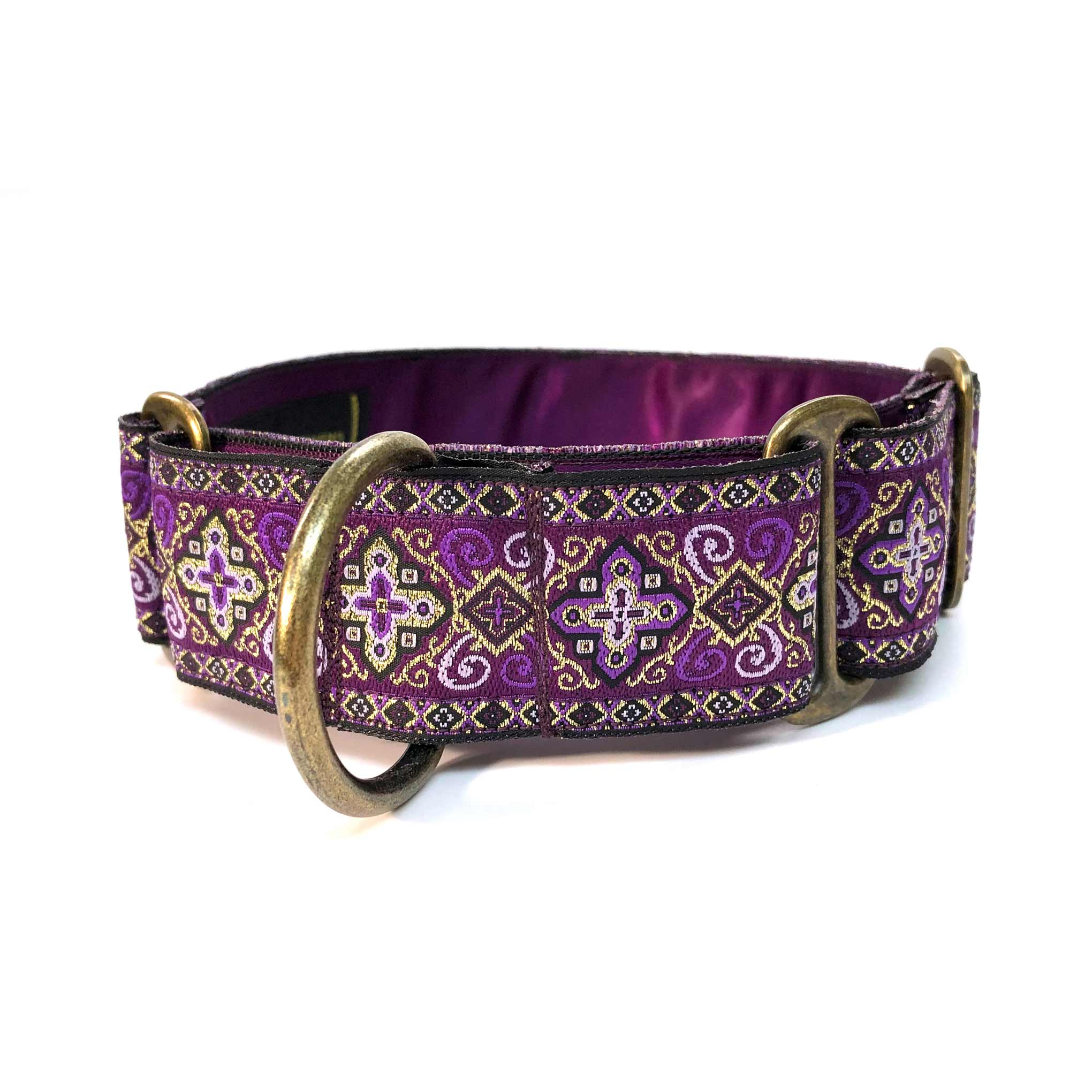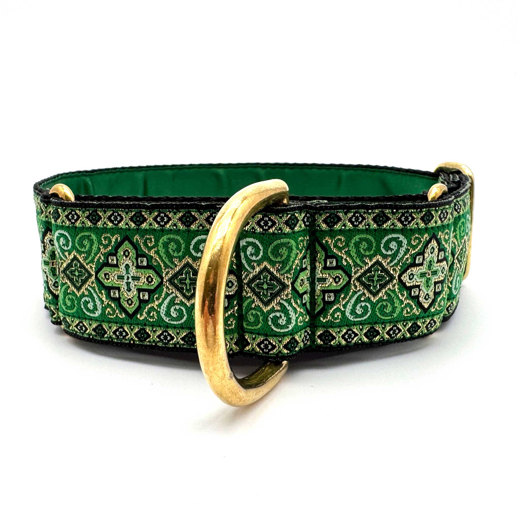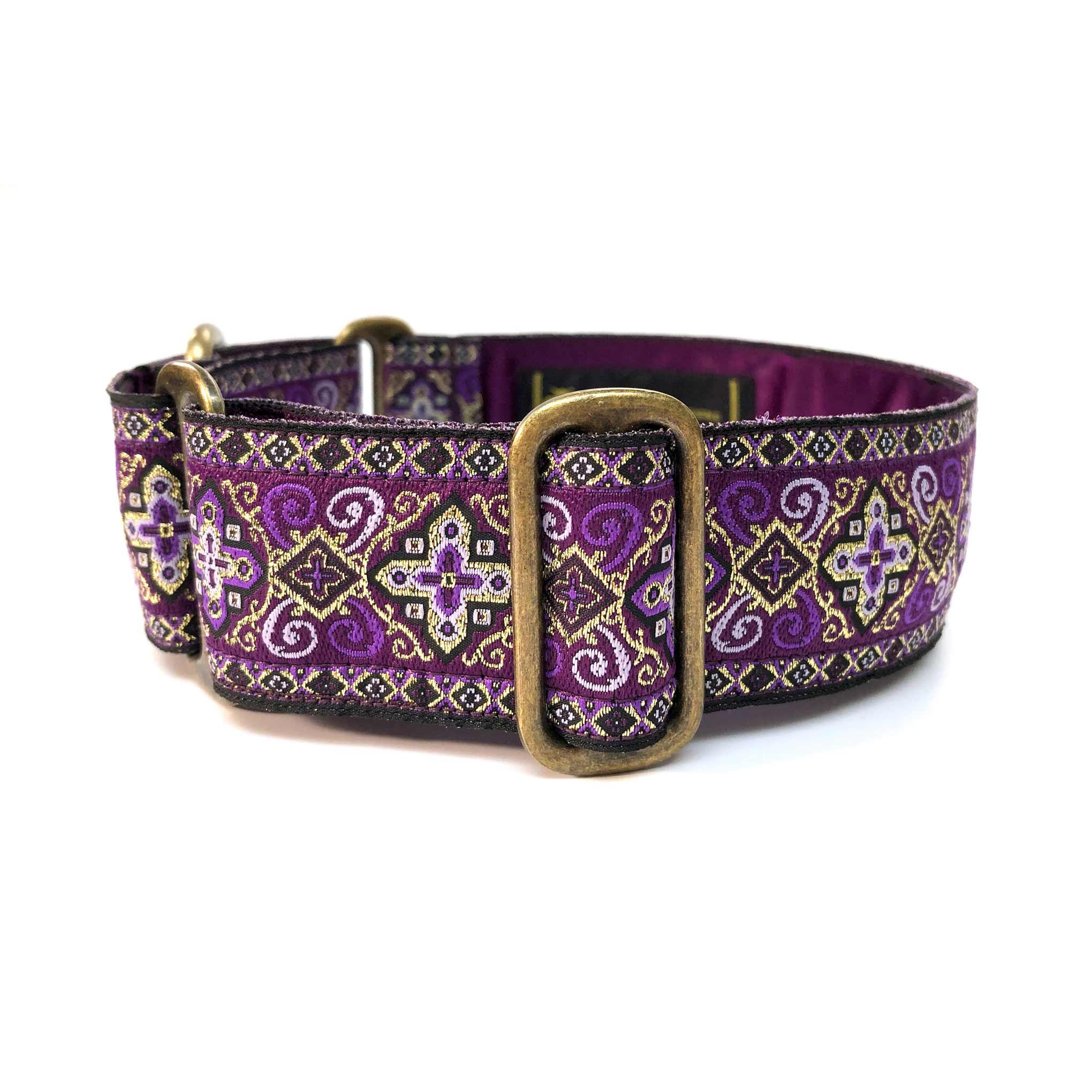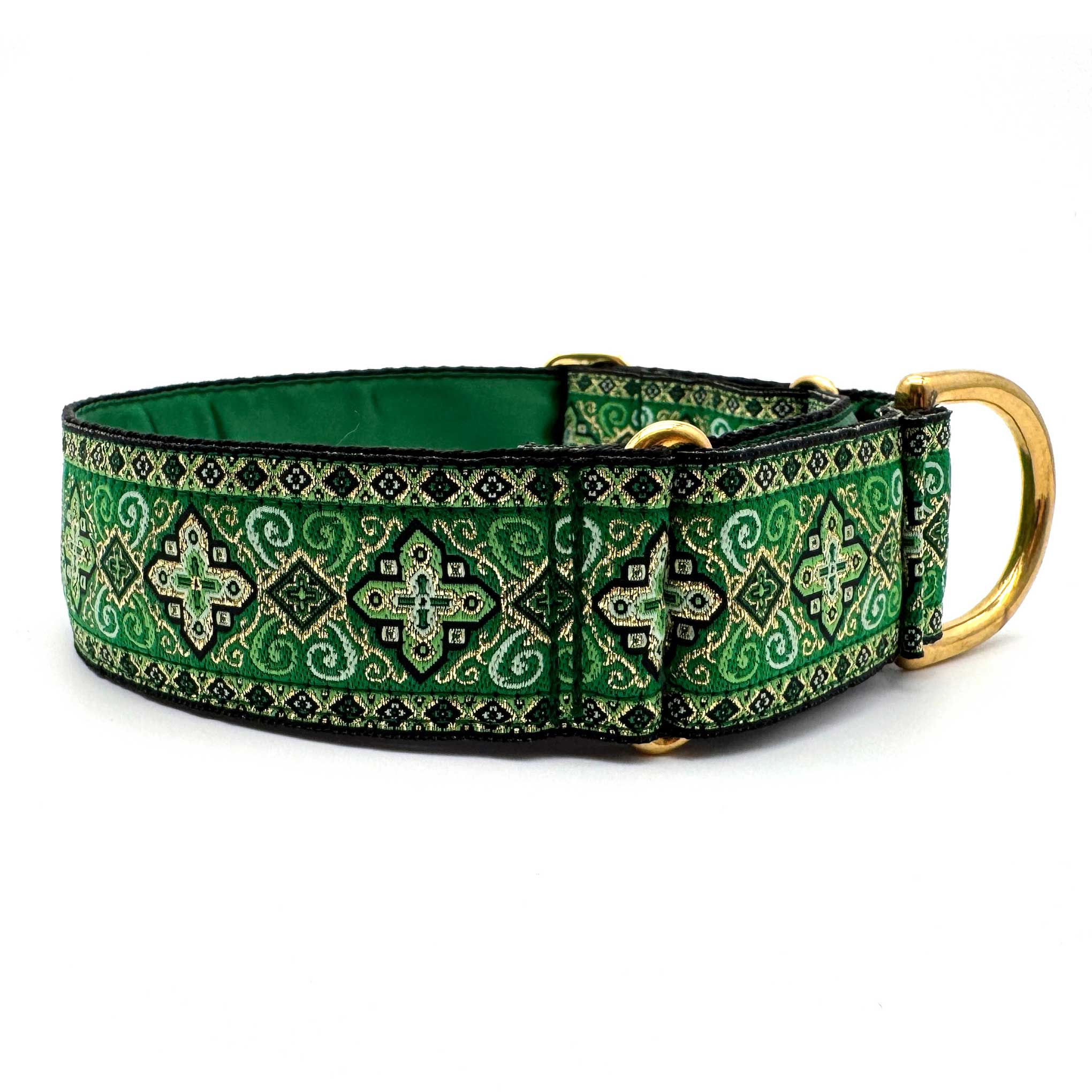 38mm (1.5") wide adjustable martingale dog collar featuring a rich jacquard ribbon with ornate geometric black and gold detailing woven into a vibrant coloured background. Lined with soft satin for comfort and finished with a choice of premium hardware, for a majestic statement.