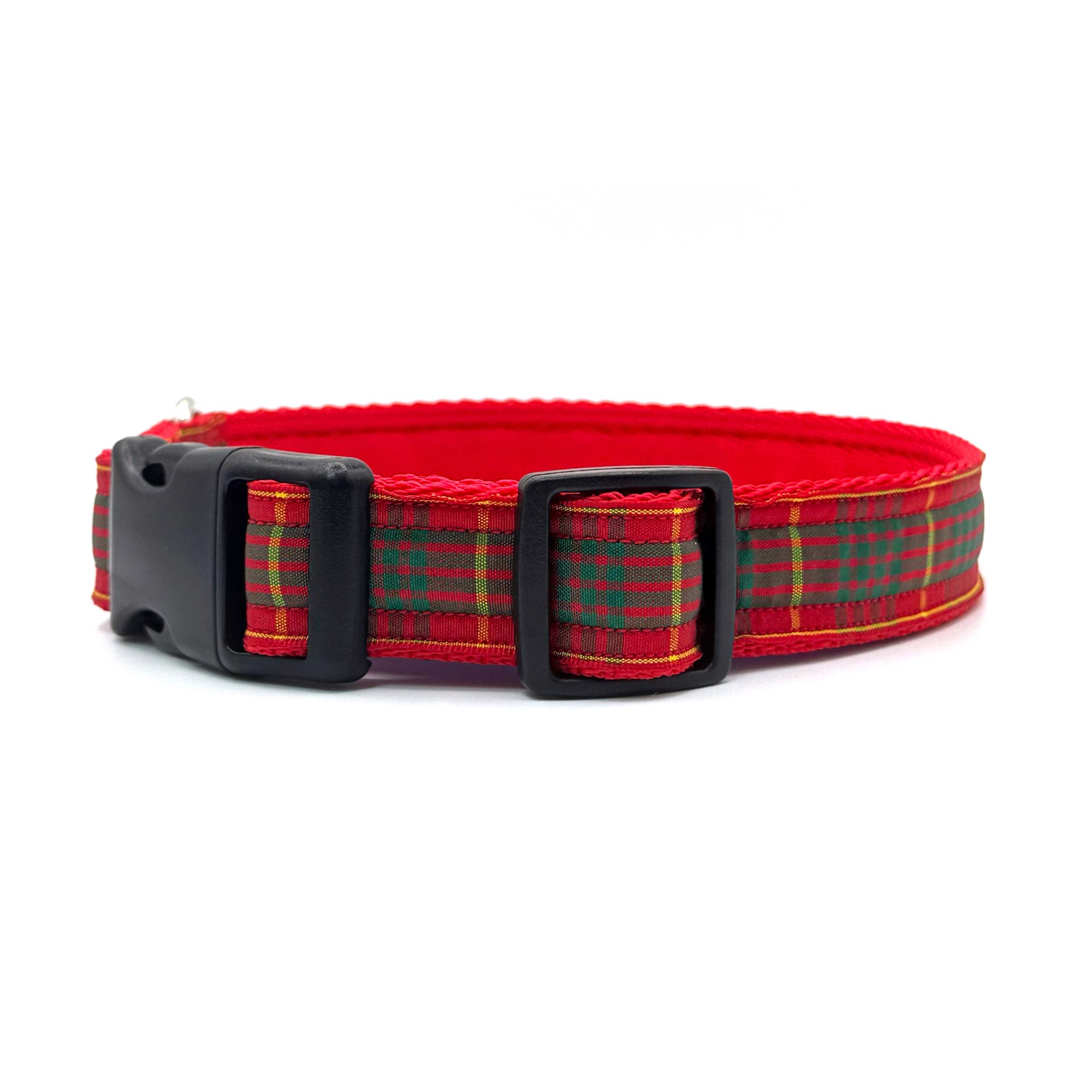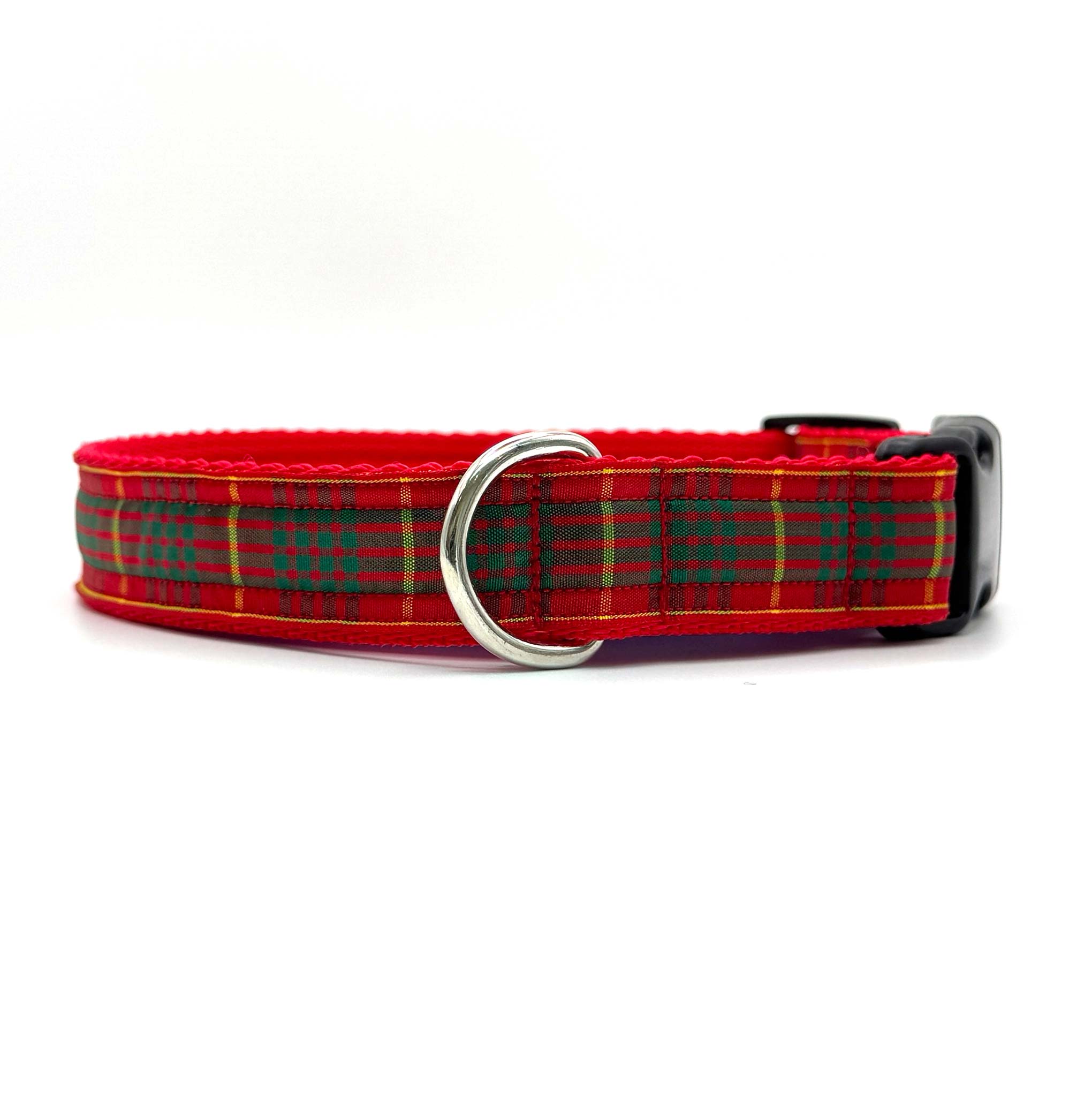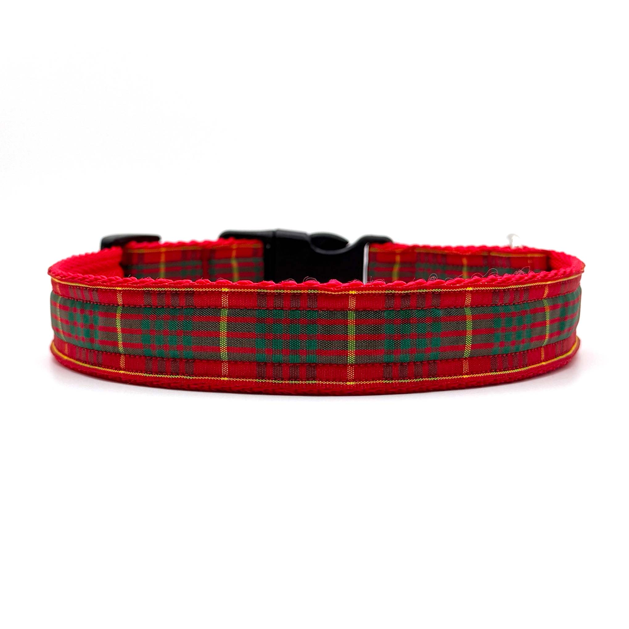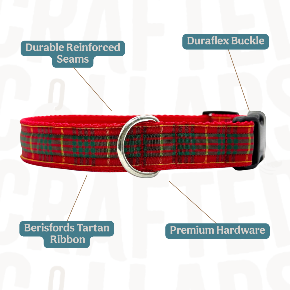 Made with authentic Berisfords Scottish tartan ribbon, the Cameron tartan range is a bold and traditional pattern, with a deep red background colour, thick green stripes and thinner yellow lines. Available in a range of widths and sizes for every dog, these polypropylene webbing backed dog collars are finished with a secure side-release buckle and a stainless steel D ring, ensuring functionality and long lasting performance for daily wear.