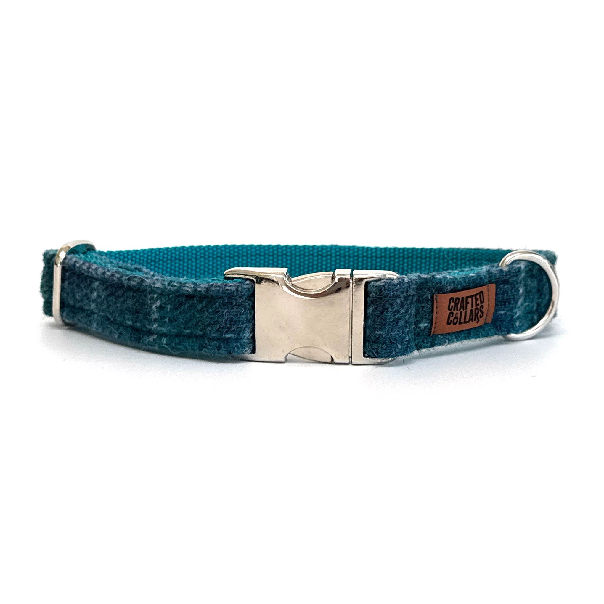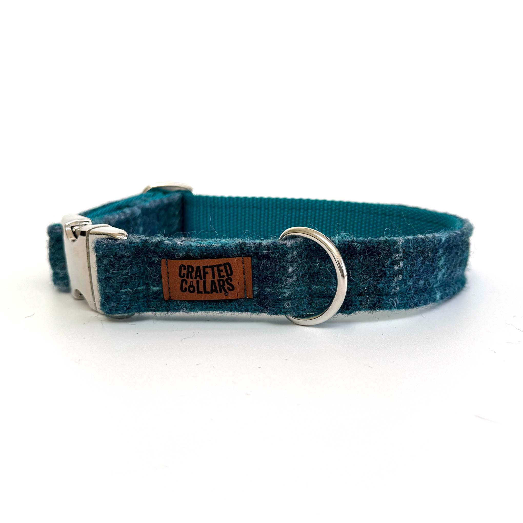 Add timeless style to your dog's wardrobe with this traditional check Harris Tweed® dog collar in shades of aqua blue, teal and green.