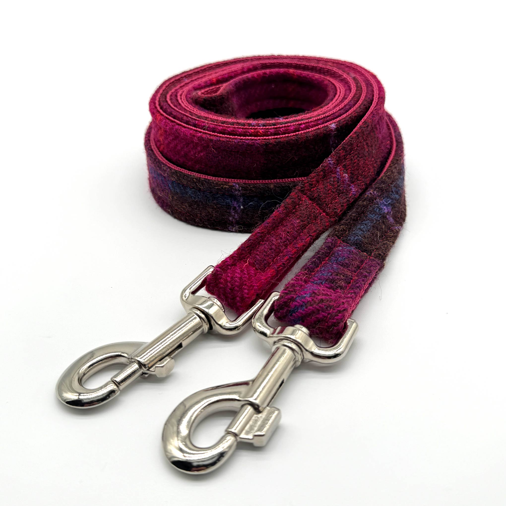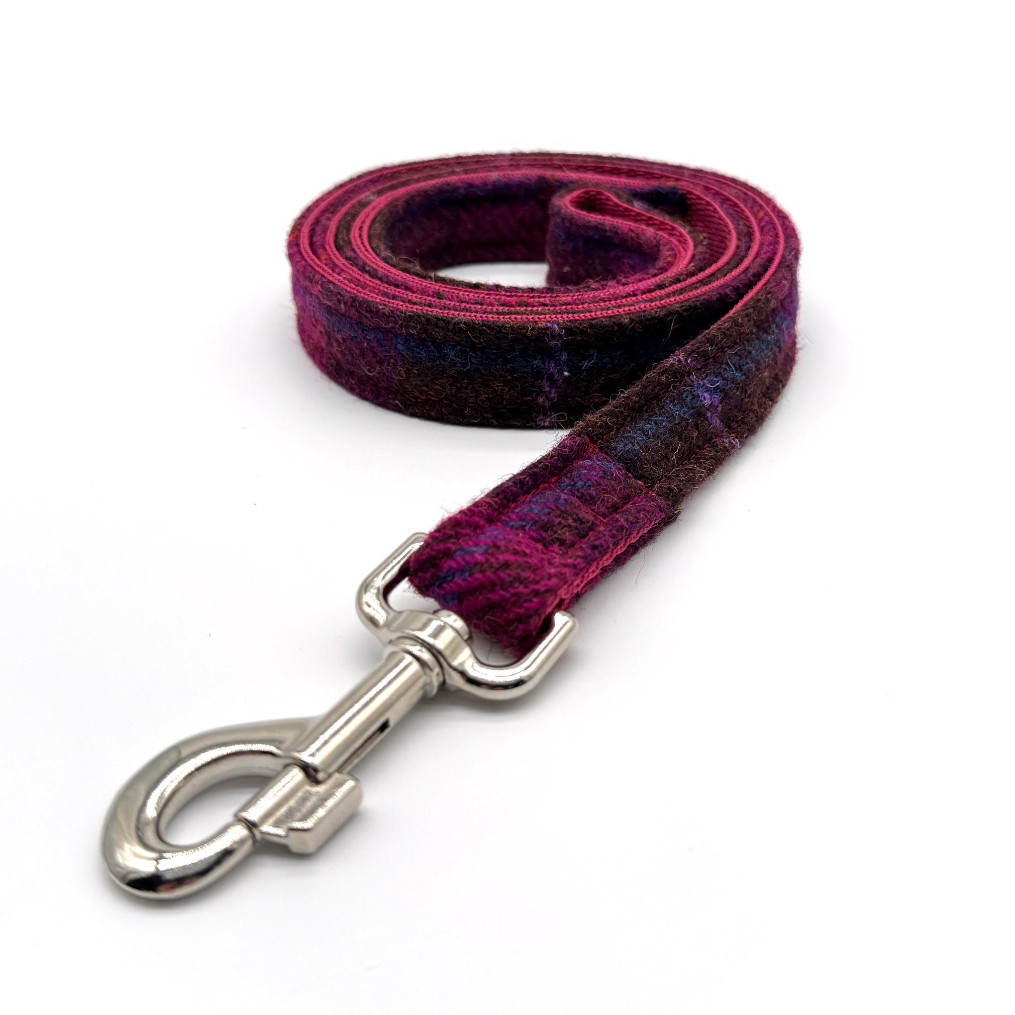 Striking burgundy, pink and brown check Harris Tweed® dog lead. Handcrafted with care, the Harris Tweed® is topstitched onto strong polypropylene webbing, offering comfort, flexibility and strength. Finished with a trigger clip in a choice of premium hardware and with the choice to add an additional D ring at the handle level. Available two widths, 20mm and 25mm, and two lengths to suit dogs of all sizes.
