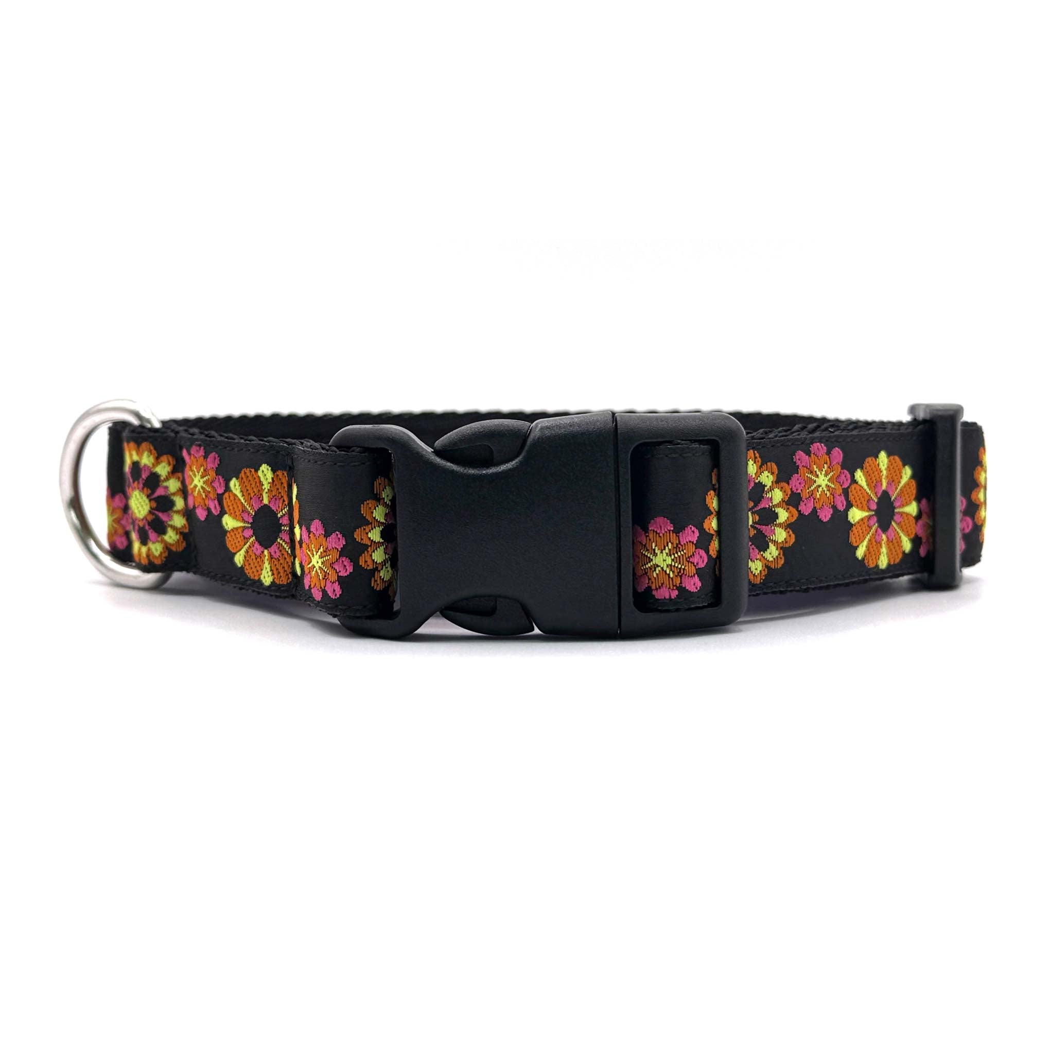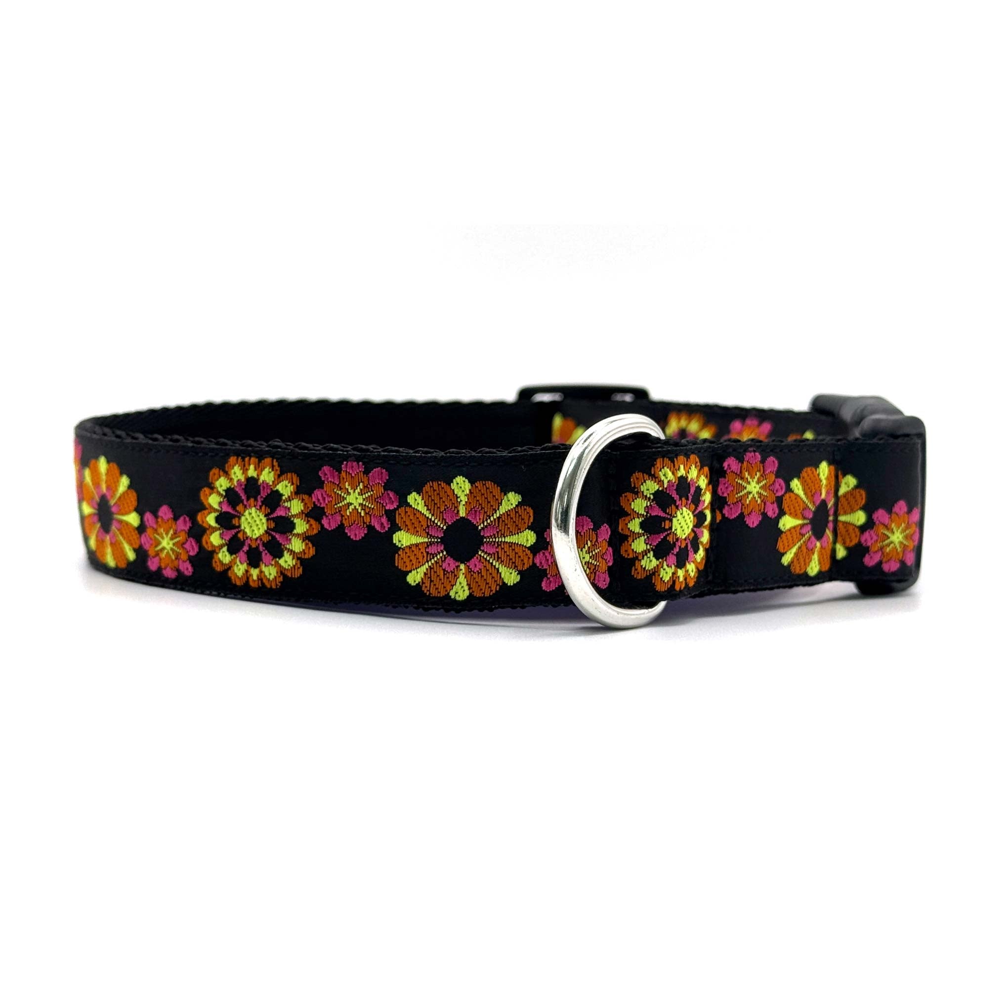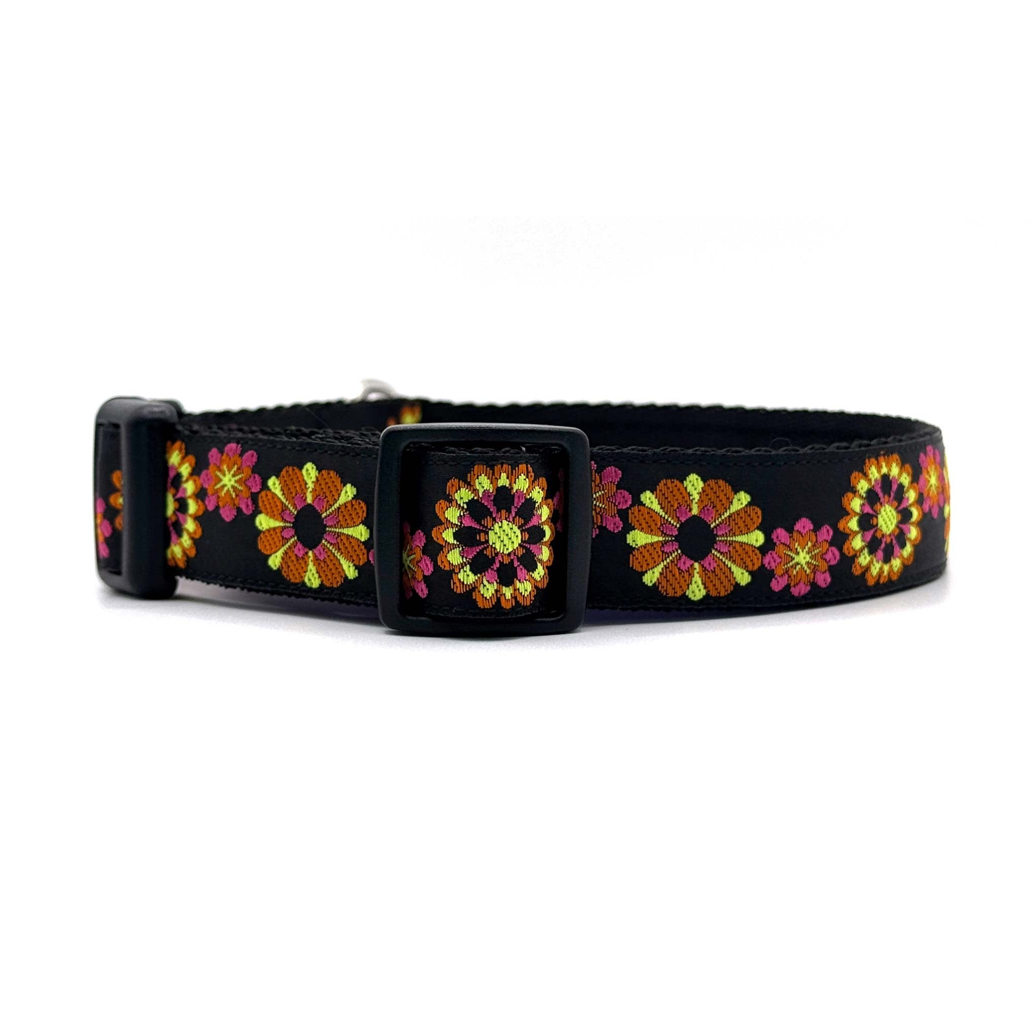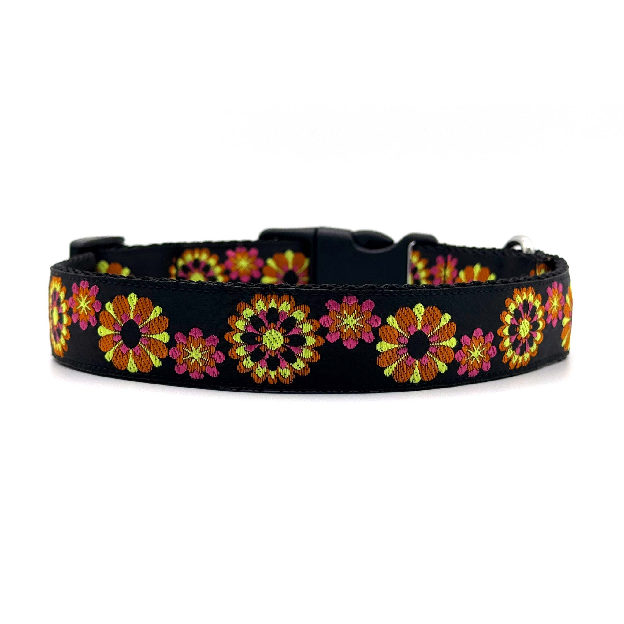 The Colour Burst dog collar features bold, vibrant floral multi colour bursts on a sleek black background.