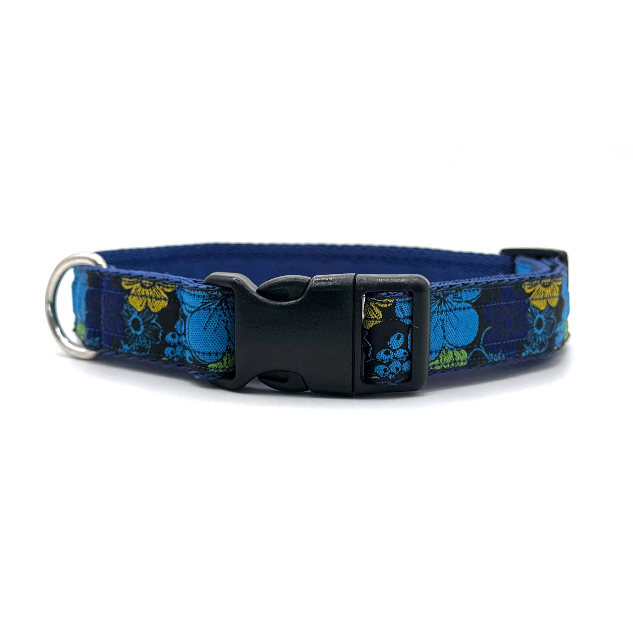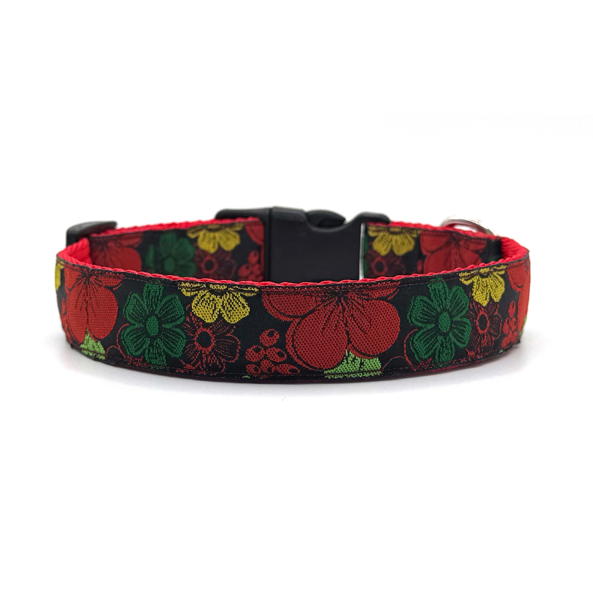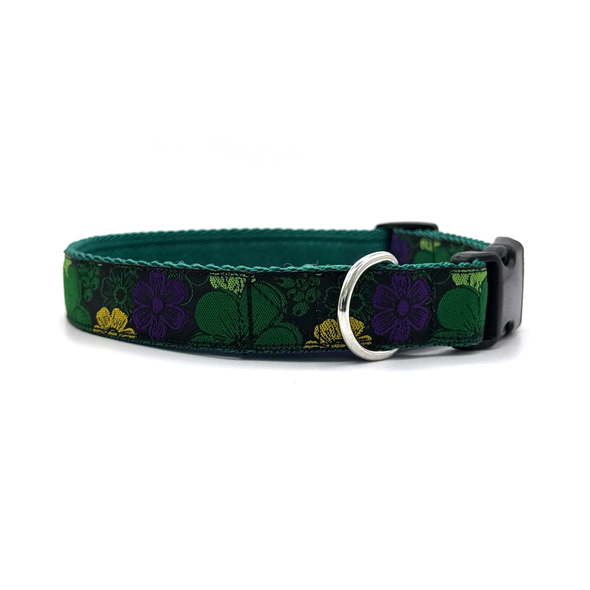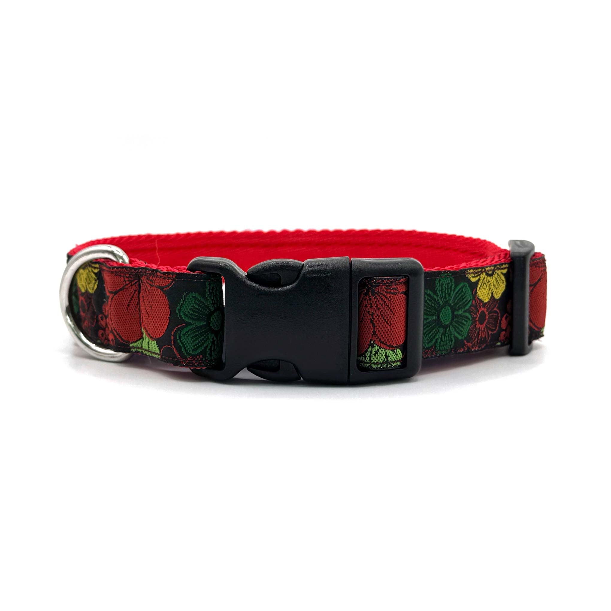 Woven ribbon features bold, bright flowers on a black background on 1" polypropylene cushion webbing. Finished with a secure premium quality Duraflex quick release buckle and a stainless steel D ring, this durable dog collar is ideal for everyday use.