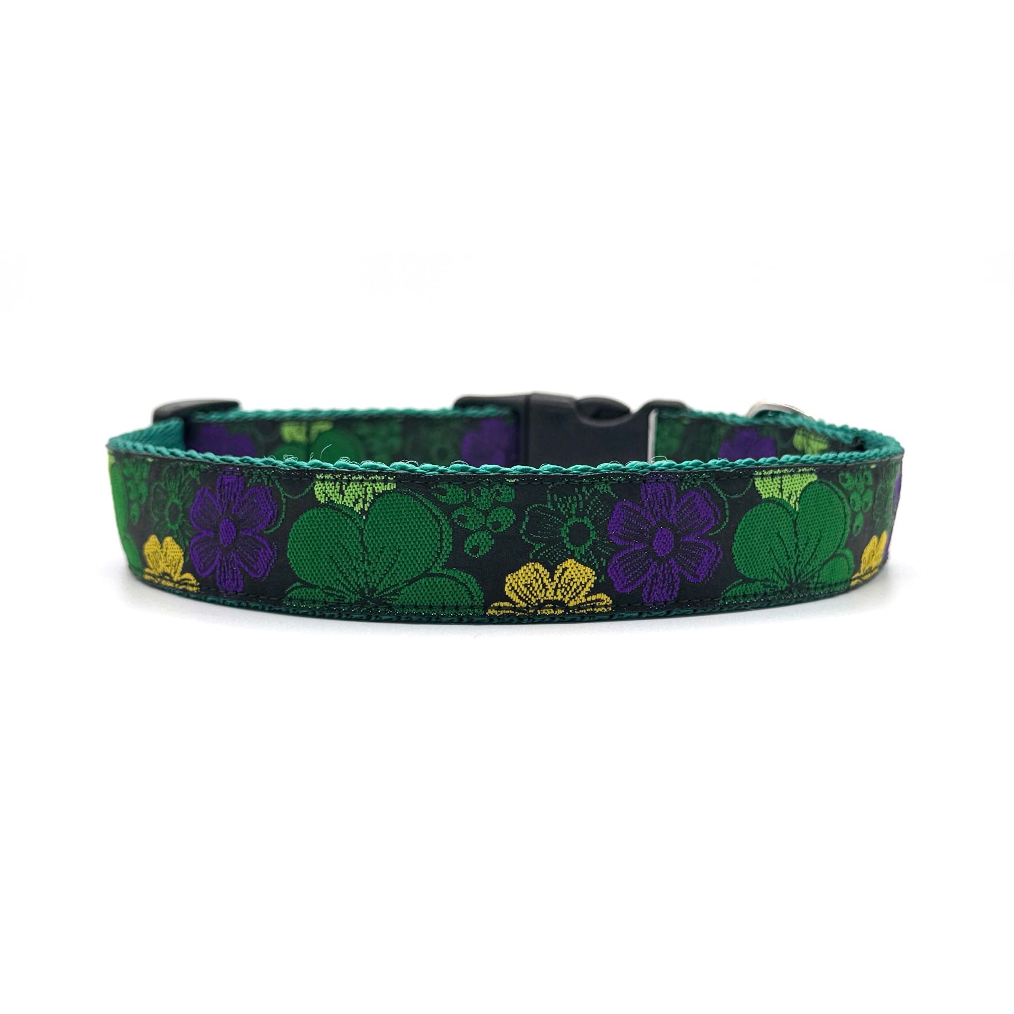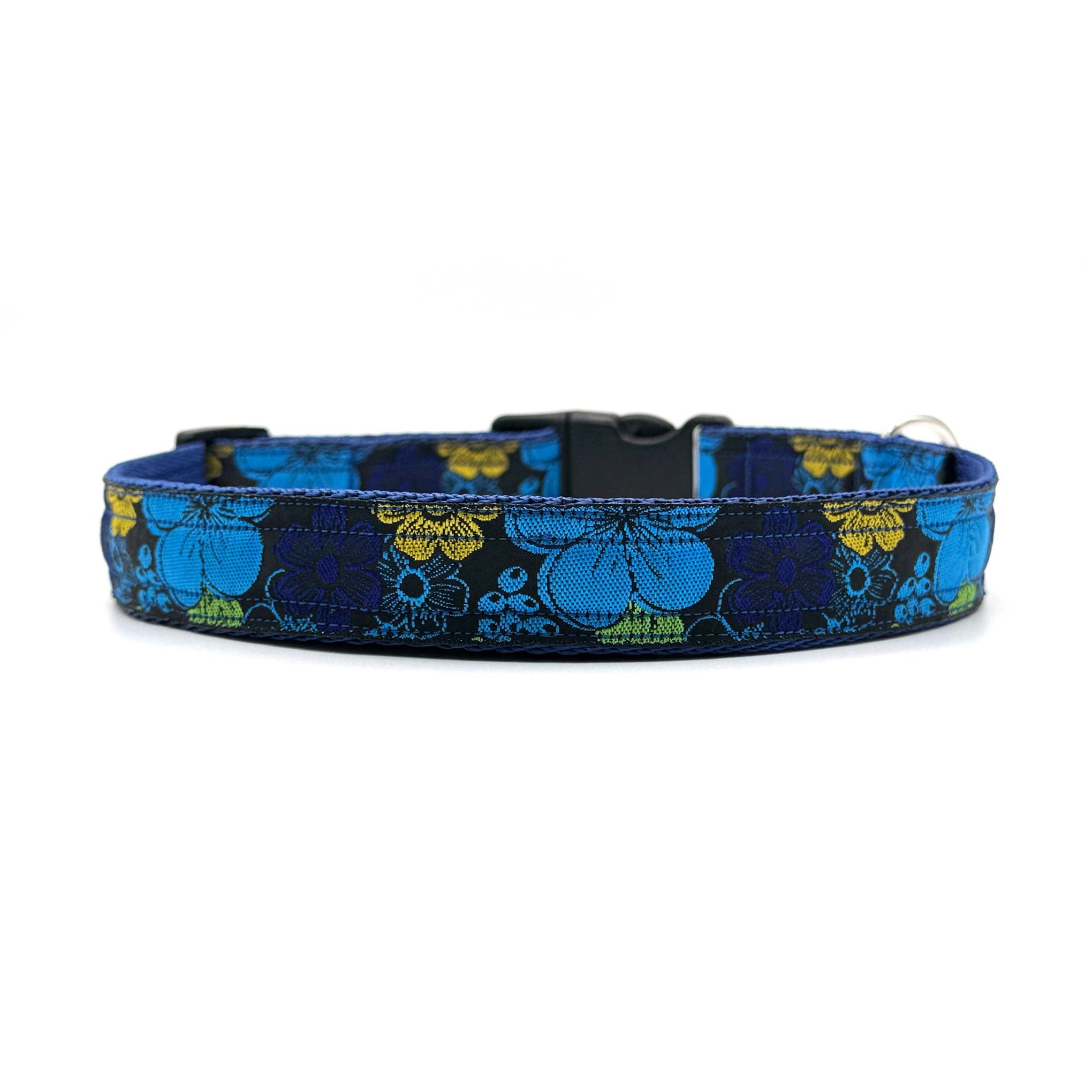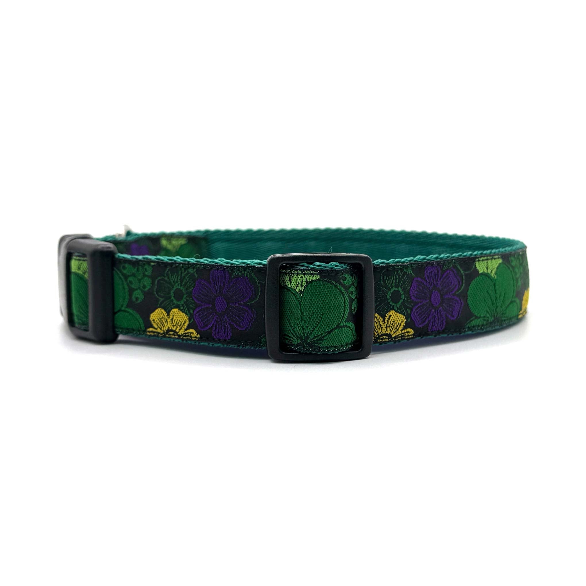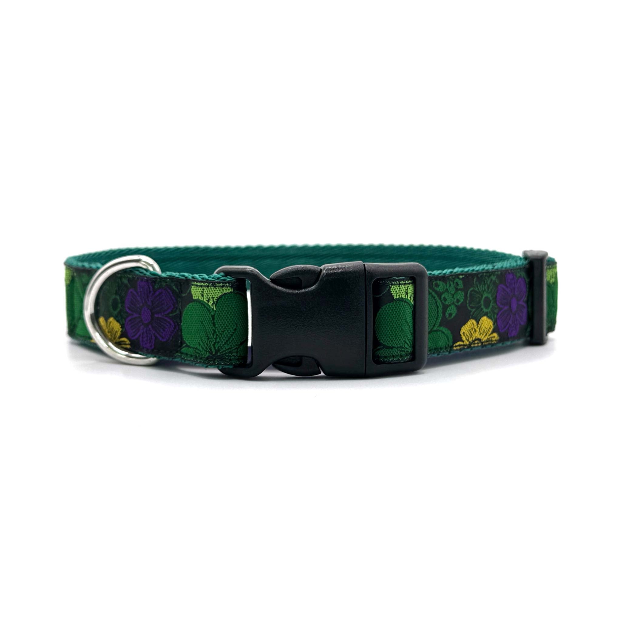 Woven ribbon features bold, bright flowers on a black background on 1" polypropylene cushion webbing. Finished with a secure premium quality Duraflex quick release buckle and a stainless steel D ring, this durable dog collar is ideal for everyday use.