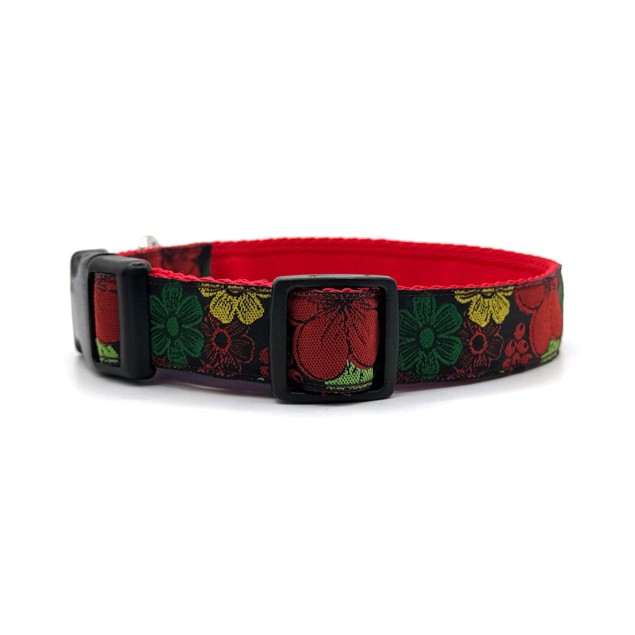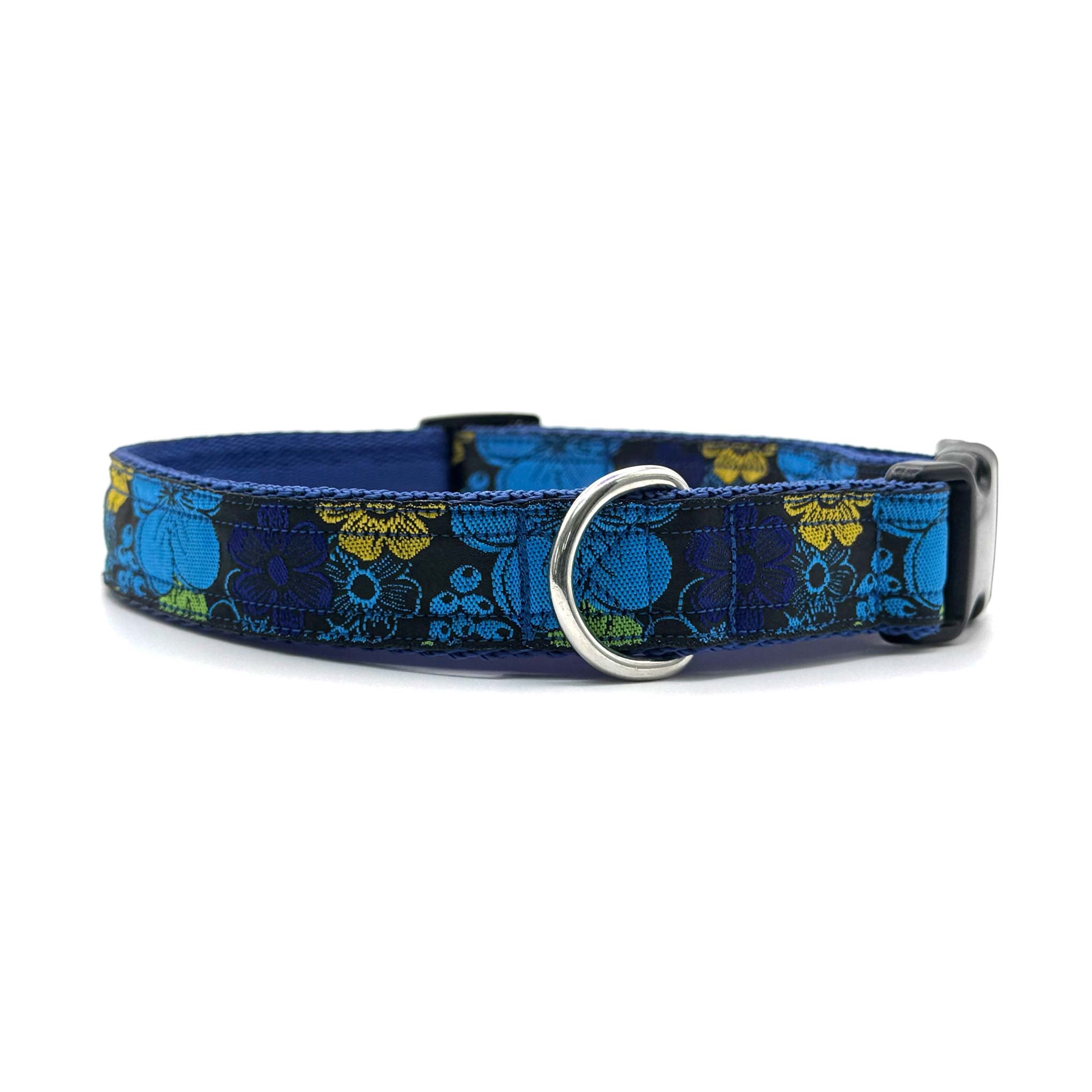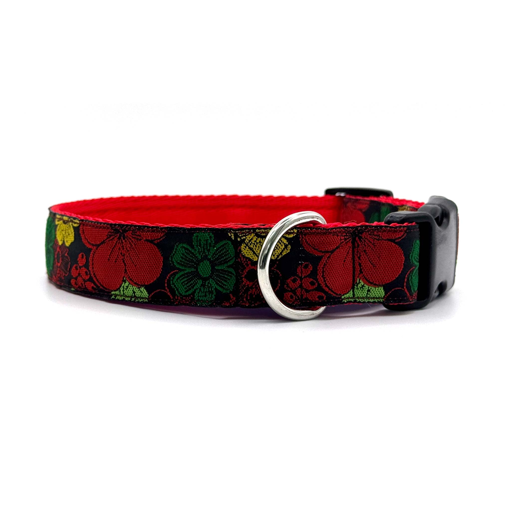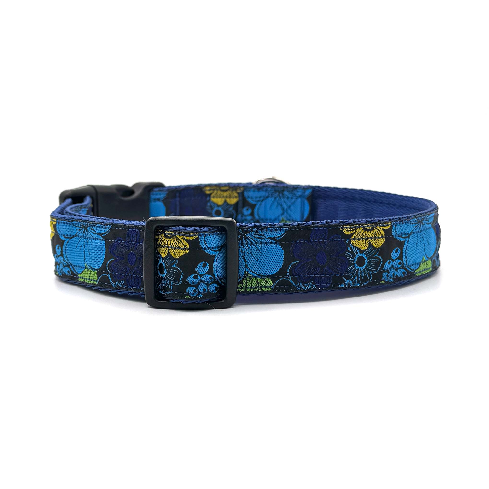 Woven ribbon features bold, bright flowers on a black background on 1" polypropylene cushion webbing. Finished with a secure premium quality Duraflex quick release buckle and a stainless steel D ring, this durable dog collar is ideal for everyday use.